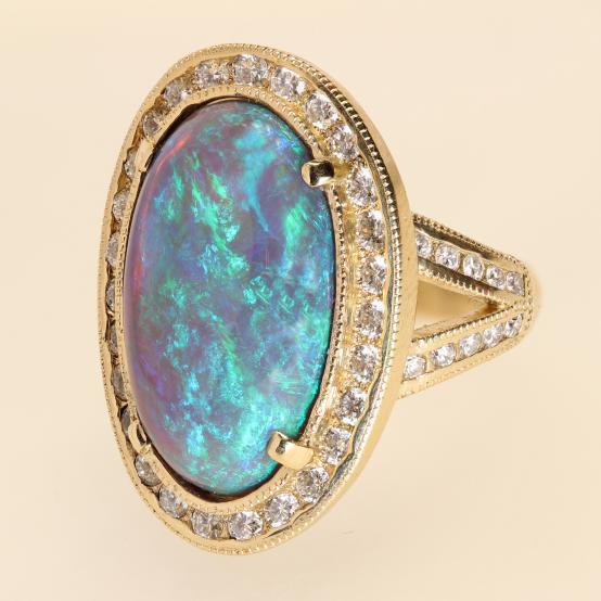 Large oval black opal with diamonds