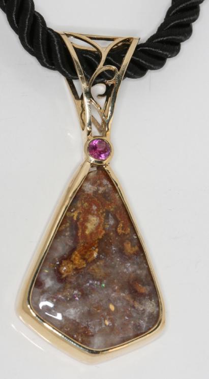 Hyalite with play of color, pink sapphire