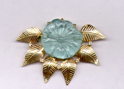 Large carved flower aquamarine (from Afghanistan) set in a 14Kt.