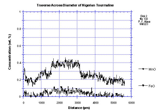 Figure 1. shows a plot of the color causing elements which are manganese (Mn) and iron (Fe). The Mn is responsible for the strong pink hue (and probably as Mn3+ as noted by Schmetzer, above). Interestingly enough, the Mn is most abundant (0.40 weight% measured as MnO, I have no way of determining the valence. To convert to Mn2O3 multiply by 1.11) in the core of the stone, but that is where the color is orange. It appears to me that the Fe, while only present at the 0.08 weight% (measured as FeO) level (one-fifth of the Mn concentration), is able to modify the color to orange. It is possible that the Mn is present as Mn2+ in the core (corresponding to the sudden change in MnO concentration) but as Mn3+ in the rims. Mn2+ also colors tourmalines pink but much less intensely and would be more easily modified by the Fe. The outer zones of the crystal are Fe-free (the plot shows only analytical noise). There, the color is vivid purplish-pink, even though the Mn content is much lower. You might ask what elements are found in the clear, blue, and green zones. The answer is that I have not looked at these zones in this material. I have checked other elbaites and found that green zones are Fe-rich and Mn-free, while the clear zones between pink and green have approximately equal amounts of Mn and Fe. The two appear to cancel out each others colors! I have not personally analyzed blue tourmalines, but Fritsch and Rossman (G&G, Vol 24, 1988, no. 2, pp. 81-102) suggest Fe2+ and Ti4+ and a possible charge-transfer mechanism.