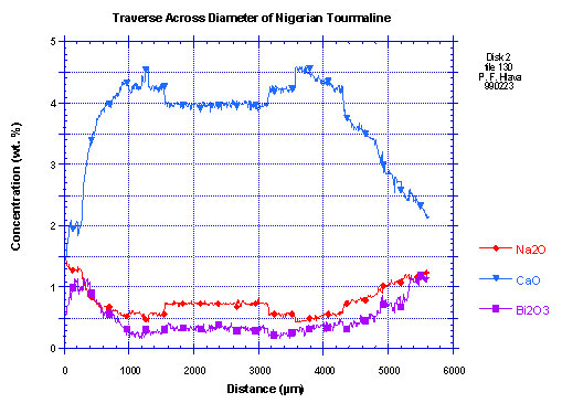 Three other elements that I analyzed in this stone, calcium (Ca), sodium (Na), and bismuth (Bi), show interesting patterns (Fig. 2). Ions of all three of these are quite close in size, and they would share occupancy of the alkali site (the W-site) in the tourmaline structure. Because Ca is, by far, the most abundant of the three, there is not enough aluminum (Al) to satisfy the X-site. Thus, there must be Li in the structure, and Fe and Mn are only present as traces. These tourmalines are probably liddicoatites rather than elbaites or other species. (End-member liddicoatite would contain just under 6 weight% CaO.) I had never heard of tourmalines with Bi in them, and I thought that this was a new development. When I was in Tucson, I chatted about these stones with the folks from Coast-To-Coast Gems. Brad Wilson mentioned that Bi is found in other tourmalines from Lundazi, Zambia. I later called Brad, and he directed me to the article by Johnson, et al. in the Fall, 1997 issue of Gems and Gemology, pp. 204-211 titled "Multicolored Bismuth-Bearing Tourmaline from Lundazi, Zambia". This article mentions several other references to Bi-bearing tourmalines, including those from Paraiba. It does appear that these Nigerian tourmalines have higher concentrations than any of the other reported occurrences.